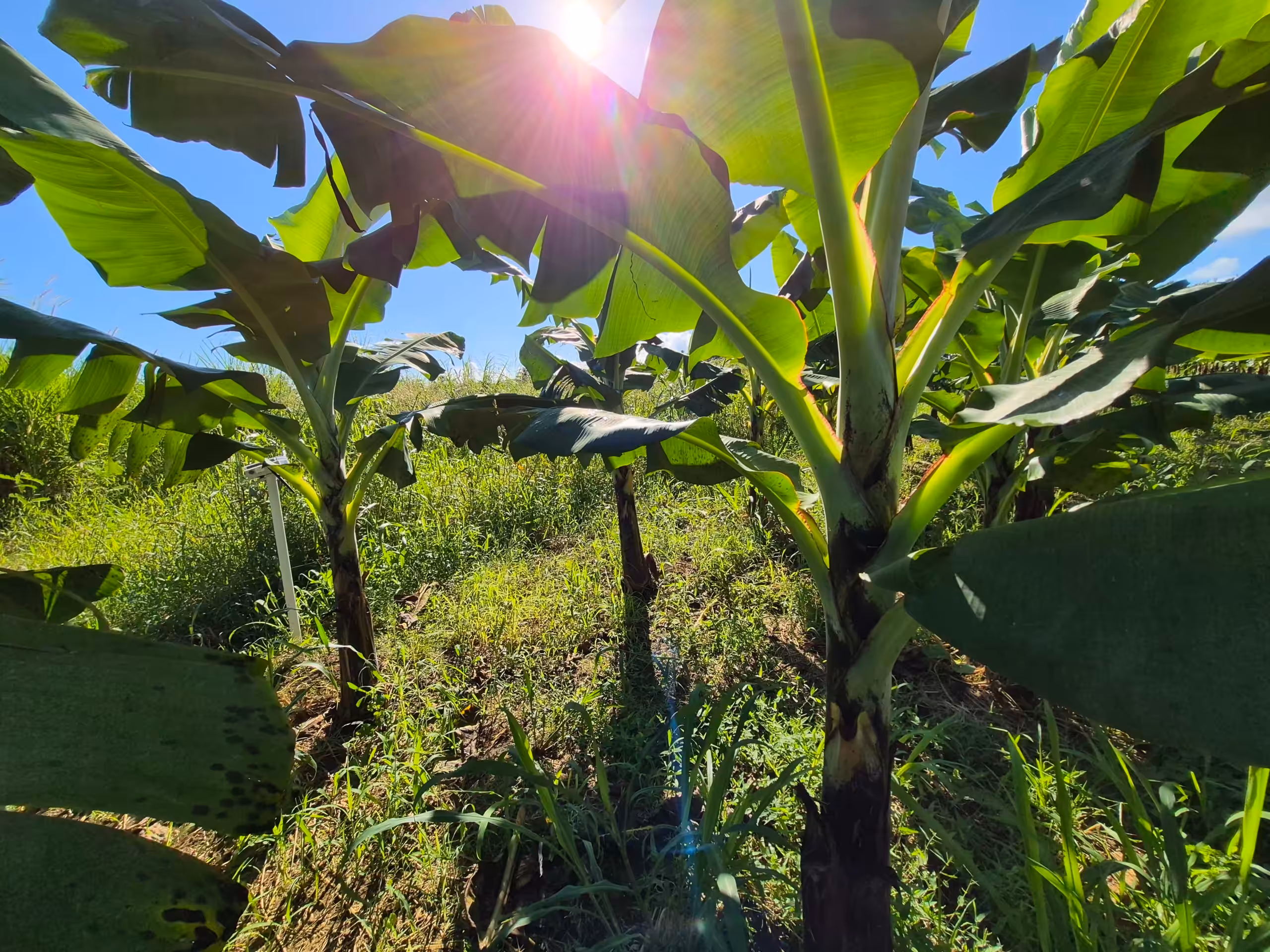 En Martinique, entre deux averses de pluie battante, Marcus Héry, directeur de l’IT2 et Élie Lare, chef de projet Cercotrop, choisissent de nous présenter leurs avancées sur la cercosporiose noire : « Apparue en 2010 en Martinique, la maladie met entre dix et quinze ans à s’installer sur un territoire. Nous y sommes clairement arrivés, avec une forte pression généralisée et accentuée sur les zones les plus humides. La très forte capacité du pathogène à contourner nos moyens de protection nous conduit à diversifier nos méthodes au maximum. ». Densité culturale, variété et fertilisation foliaire en oligoéléments influencent le développement du bioagresseur. Une baisse drastique de la densité de plantation à 1 350 pieds/ha au lieu des 1 800 habituels permet une réduction de 40 % de la maladie, mais ce levier n’est pas encore économiquement viable. Des fertilisations foliaires avec magnésium, bore, cuivre, zinc, extraits d’algues sont testées sur vitroplants inoculés en cercosporiose, puis au champ de façon plus affinée. La micronutrition en magnésium montre déjà une réduction de 17 % de la maladie sur le premier cycle de récolte. Encourageant, mais à peaufiner et à rendre applicable à grande échelle !